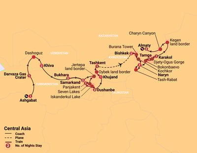✓ Explore the famous 5 Stans of Central Asia: Turkmenistan, Uzbekistan, Tajikistan, Kyrgyzstan and Kazakhstan