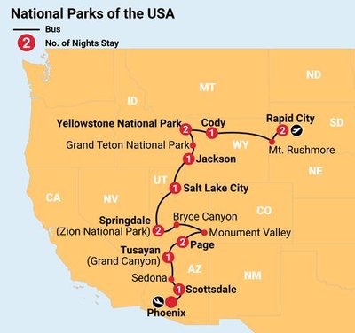 3 – Moderate Tour: This moderately active program covers a fair amount of ground each day. Expect from three to four hours walking on some touring days. There are two long bus rides necessary to cover the territory (Salt Lake City to Jackson and Cody to Rapid City). The pace is moderate, however you will encounter some uneven surfaces, steps and slopes. The altitude in the National Parks varies and may be a consideration for those who have heart conditions or are otherwise affected by height. Hotels in National Parks provide limited amenities. During this tour, you may come into proximity of wild animals whose actions can be unpredictable. Certain inherent risks are involved which should be considered at your own discretion. Airport transfers are not included. Consider a taxi or shared ride service as the least expensive options.