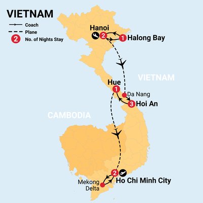 Explore Vietnam’s cultural highlights over 10 exciting days: a guided tour of Hanoi, an overnight Halong Bay cruise, cruise the Perfume River in Hue and experience the charm of Hoi An. End the tour with Ho Chi Minh City’s vibrant sights and a Mekong River cruise - this won’t be your last visit to Vietnam.