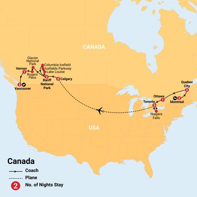 Explore the best of Canada on this unforgettable journey. Start with Toronto, Niagara Falls, Ottawa, Quebec, and Montreal’s rich history and vibrant culture. Then, marvel at the Canadian Rockies, including Lake Louise, Banff National Park, and the Icefields Parkway. Ride the iconic Rocky Mountaineer for a spectacular rail adventure. Get ready for the adventure of a lifetime—uncover Canada’s natural wonders and vibrant cities like never before!