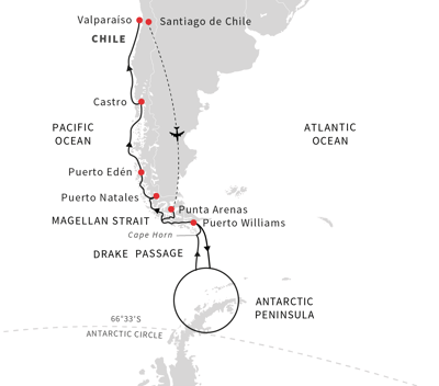 ✓ Round-trip transfers between Santiago de Chile airport and hotel in Santiago de Chile before and after the expedition cruise