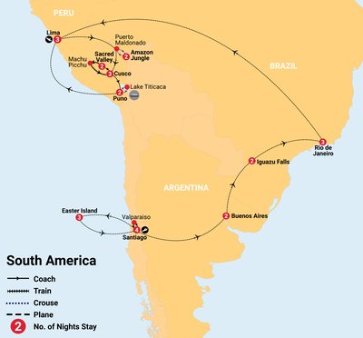 While touring South America, you will be travelling by private coaches, planes, boats, and trains. South America is a very large continent, and to see all that it has to offer then there will be some long travel journeys on the coach. But rest assured there will be comfort stops along the way where you can freshen up, stretch your legs, use the bathroom and often, purchase refreshments. Generally, lunch stops will be taken at rest stops as they can easily accommodate our large groups.