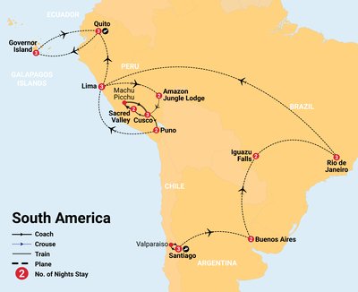Embark on a vibrant journey through South America, beginning with Santiago’s rich history. Explore Buenos Aires' tango-filled streets, then marvel at Iguazu Falls. Soak in Rio's iconic beaches and Christ the Redeemer, before discovering Peru's ancient wonders like Machu Picchu. Conclude with a serene, wildlife-rich cruise through the Galapagos Islands.