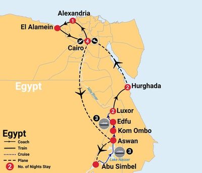 Uncover the rich history and vibrant culture of Egypt on this unforgettable journey. From the ancient Pyramids and bustling bazaars of Cairo to the monumental temples of Abu Simbel and Luxor, cruise Lake Nasser and the Nile, explore Alexandria and El Alamein, and unwind in the coastal beauty of Hurghada.
