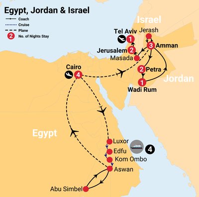✓ Incredible sightseeing including the spellbinding Pyramids of Giza and the Great Sphinx, majestic Karnak Temple, marvel at the ancient Abu Simbel temples,explore the Roman Ruins of Petra and the Nabatean city of Petra, float in the Dead Sea, explore the ancient fortress of Masada and all that the historic city of Jerusalem has to offer