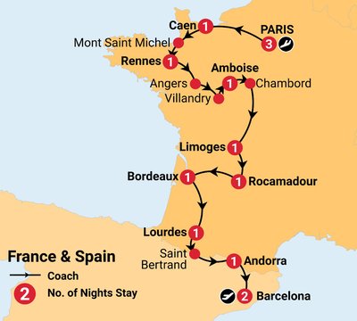 ✓ Incredible sightseeing including city tours of Paris & Barcelona as well as visits to Monet´s house in Giverny, Villandry gardens, Chenonceau castle, castle park of Chambord, Beynac castle, Padirac caves, Cite du Vin in Bordeaux, Poble Espanyol in Barcelona and others