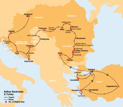 This tour covers multiple countries across the Balkans and Turkey, travelling primarily by private, air-conditioned coach, with some internal flights in Turkey. The journey showcases a diverse range of landscapes, from vibrant cities and historic towns to rural countryside and mountain regions.