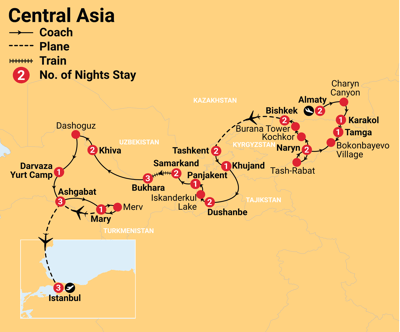 ✓ Explore the famous Five Stans of Central Asia: Turkmenistan, Uzbekistan, Tajikistan, Kyrgyzstan and Kazakhstan