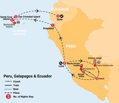 ✓ 17 nights in 3 & 4-star hotels, including 2 nights at an eco-friendly Peruvian Amazon lodge and 4 nights in the Galapagos National Park