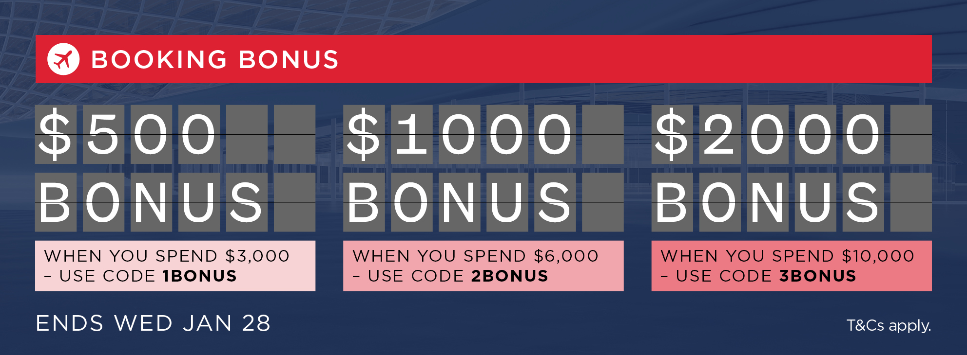 Get money off your current booking, plus a future travel voucher for $500 off your next booking. Call our travel specialists on 1 888 356 2021 or book online using the below codes to claim your bonus.