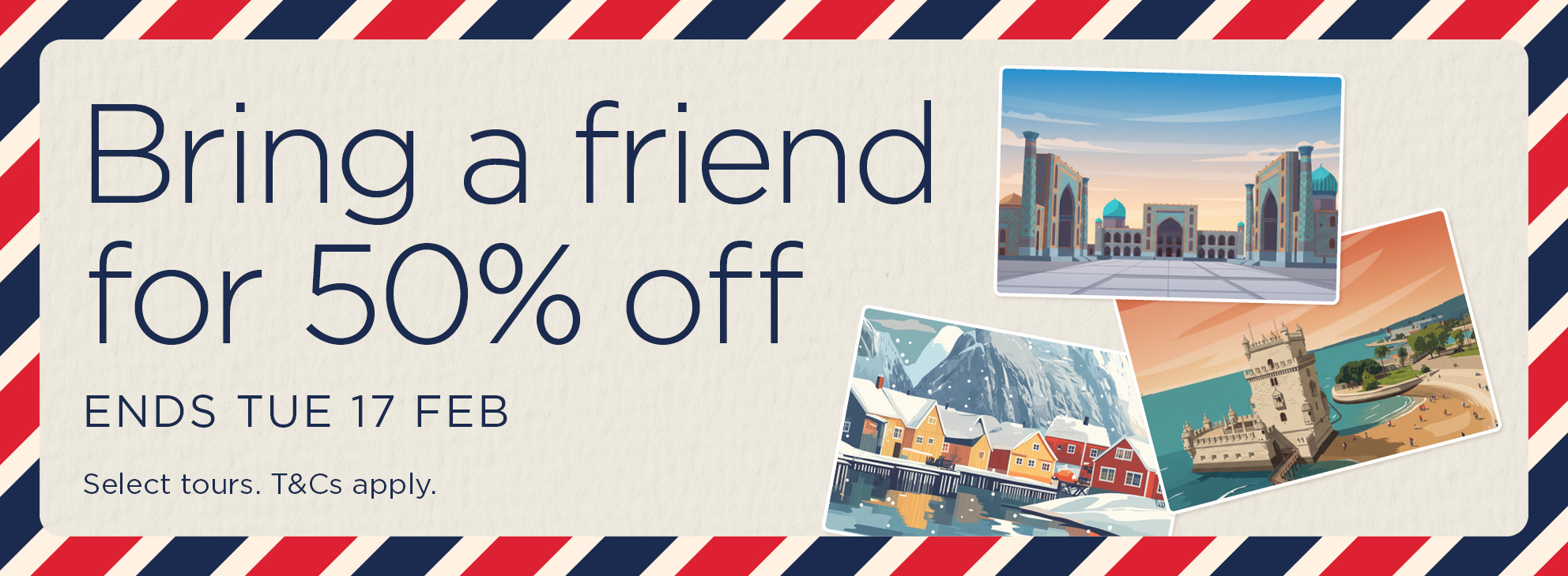 With our new limited-time Bring A Friend Half Price offer, the second traveller saves 50% off their place with code BUDDY50. Offer ends Tuesday 17 February 2026.