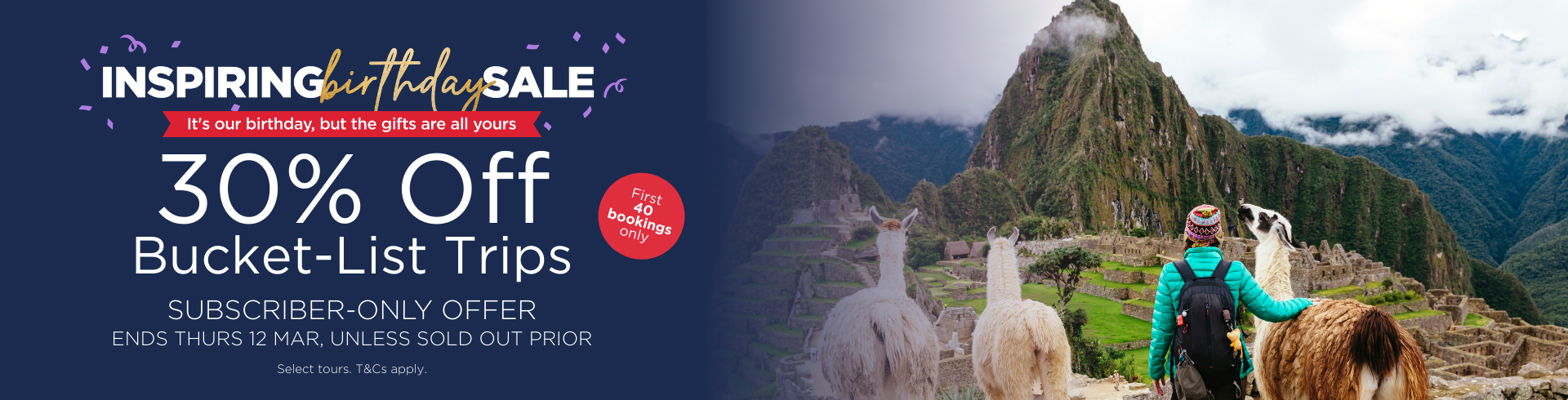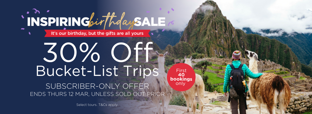 Be inspired with the latest subscriber-only deal taking 30% off some of our most-loved inspiring destinations. Use code SECRETTRIP to book online or call our travel specialists on 1 888 356 2021 to secure your place. Offer is limited to 40 bookings and ends Thursday 12 March 2026 - or earlier if sold out.