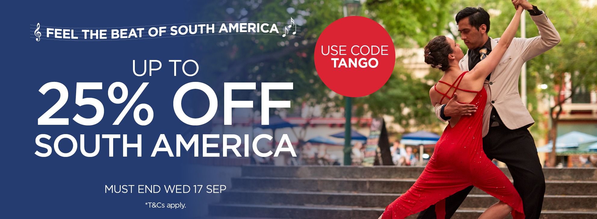 Feel the beat of South America with our latest sale. Save up to 25% off South American holidays with code TANGO. But be quick - this sale will take its final bow on Wednesday 17 September 2025.