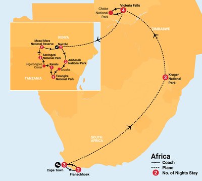 ✓ Internal flights from Cape Town to Kruger, Kruger to Victoria Falls, Victoria Falls to Nairobi and Serengeti to the Masai Mara