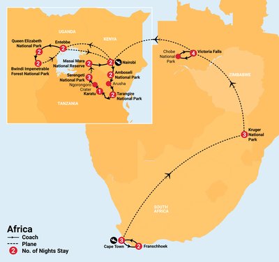 Please be advised that luggage restrictions limited to 15kg per person in a soft-sided bag applies for the flight from Serengeti to the Masai Mara on Day 22. If travelling with luggage that does not abide by these restrictions, we recommend taking an extra soft sided bag and packing essentials required for this trip. Excess luggage can be stored free of charge at your Nairobi hotel and collected on return to the hotel on Day 24.
