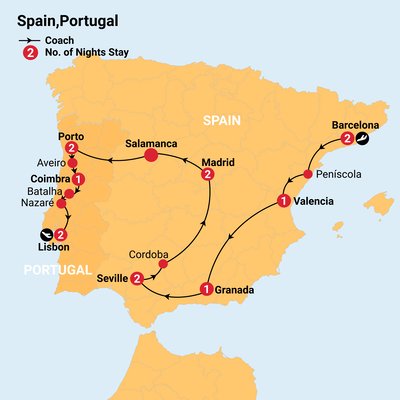 While in Spain and Portugal, you will travel by private coach. This journey spans a vast and varied landscape, providing the perfect opportunity to sit back, relax, and enjoy the scenic views. Please review the itinerary for estimated travel times.