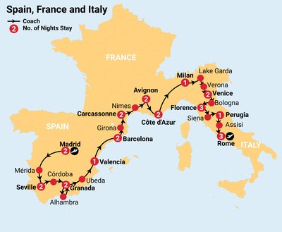 ✓ Incredible sightseeing including guided visits in Madrid, Seville, Granada, Barcelona, Carcassonne, Avignon, Venice, Rome and more throughout the itinerary