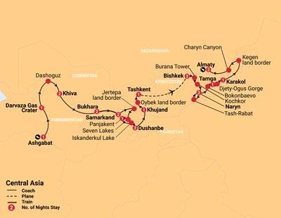 Embark on the ultimate adventure across the 5 Stans of Central Asia! Experience vibrant traditions, awe-inspiring landscapes, and UNESCO treasures on this fully guided journey through Turkmenistan, Uzbekistan, Tajikistan, Kyrgyzstan, and Kazakhstan. From Ashgabats Akhal-Teke horses to Kyrgyzstans breathtaking Djety Oguz Gorge, every day reveals extraordinary sights, authentic culture, and unforgettable memories.