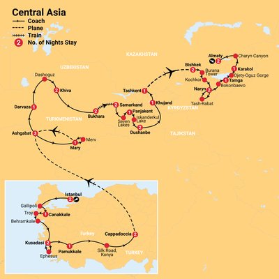 ✓ 30 nights in 3 and 4-star hotels throughout Turkey, Central Asia, and 2 nights in a traditional Yurt Camp